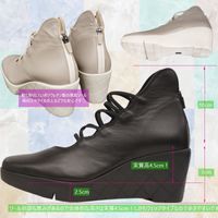 ヒールの高さは7cm。長めのスカートなどにとても役たちそうなブーツです。長く1405番という品番で好評をいただきましたモデルの後継版になります。履きやすさはそのままに少しトゥが丸くなったのとサイドが深くなったのが新しく変わったポイントです。ポリウレタンのウェッジソールに低反発のクッションが入っていますので衝撃吸収性も良く、実際にはいているお客さまから長時間はいても疲れにくく急ぐときはこのまま走ってしまうこともあるくらいはきやすいと言っていただきました